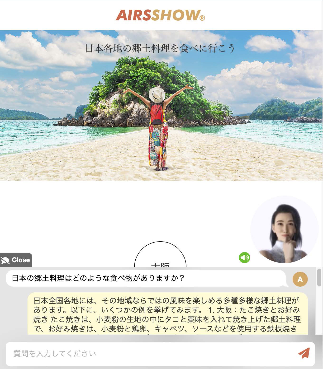 - 生成AI ChatGPTを利用したデジタルヒューマンをご利用頂けます。AirsShowで利用されているChatGPTは独自に開発された生成AIになります。各種プロンプトで制御することも可能になっています。開発には多大な技術を投入し開発されたサービスをサブスク価格でご利用頂けます。